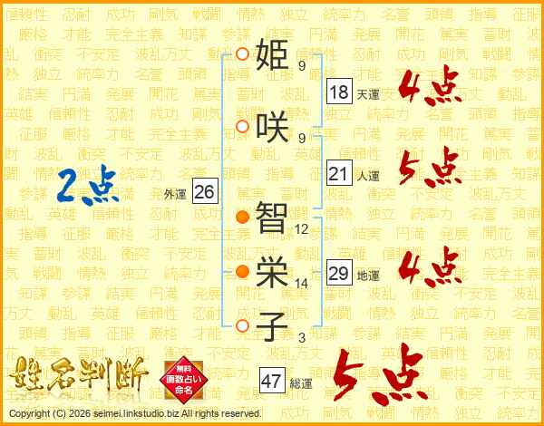 姫(9画)咲(9画) 智(12画)栄(14画)子(3画)
