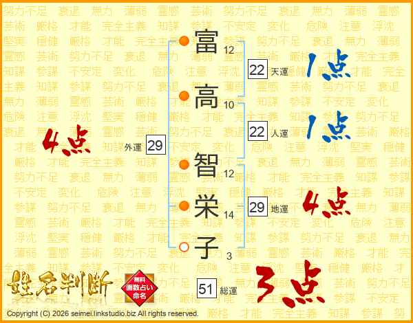 富(12画)高(10画) 智(12画)栄(14画)子(3画)