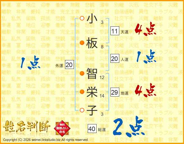 小(3画)板(8画) 智(12画)栄(14画)子(3画)