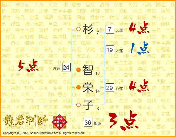 杉(7画) 智(12画)栄(14画)子(3画)
