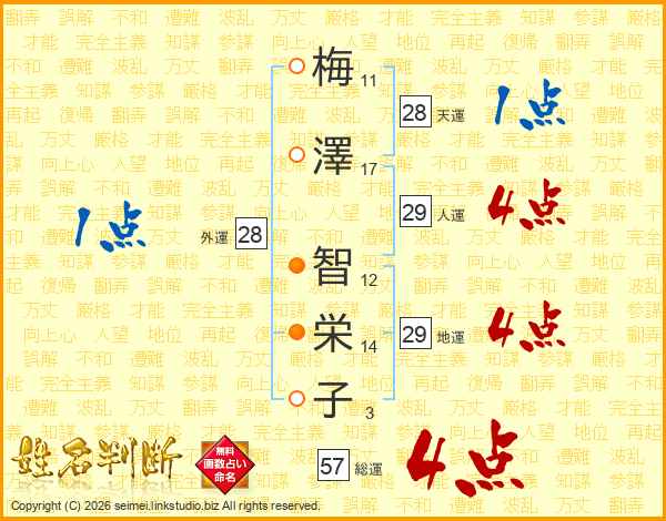 梅(11画)澤(17画) 智(12画)栄(14画)子(3画)