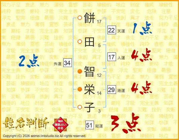 餅(17画)田(5画) 智(12画)栄(14画)子(3画)