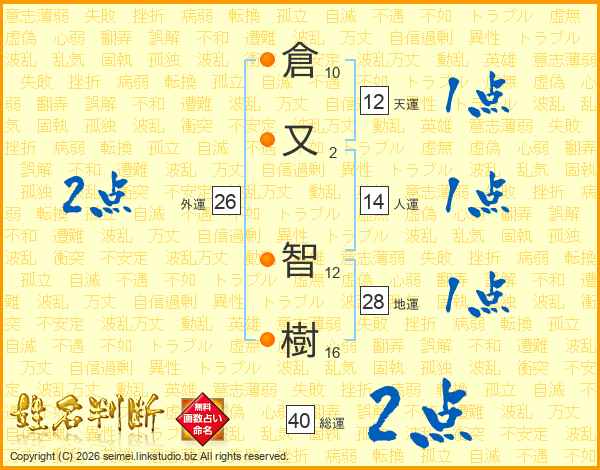 生活面を象徴する運勢です。外部から受ける影響力を表し、結婚運、家庭運や職場、環境への順応性を表します。総運から人運を引いた画数。姓や名が1文字の場合を除く。