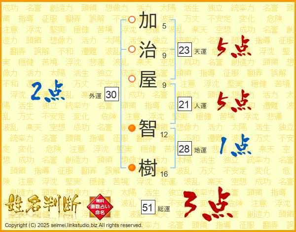 加(5画)治(9画)屋(9画) 智(12画)樹(16画)