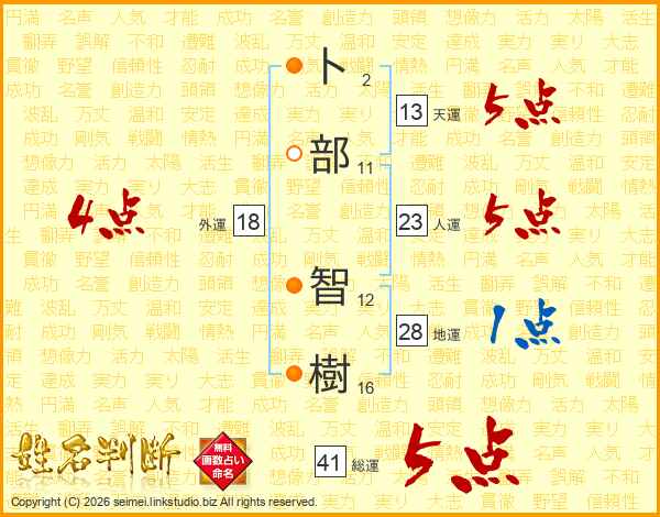 生活面を象徴する運勢です。外部から受ける影響力を表し、結婚運、家庭運や職場、環境への順応性を表します。総運から人運を引いた画数。姓や名が1文字の場合を除く。