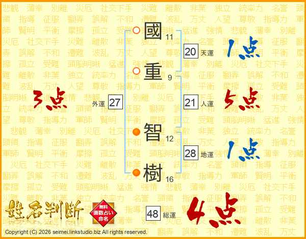 國(11画)重(9画) 智(12画)樹(16画)