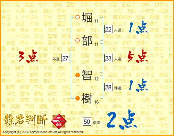 生活面を象徴する運勢です。外部から受ける影響力を表し、結婚運、家庭運や職場、環境への順応性を表します。総運から人運を引いた画数。姓や名が1文字の場合を除く。