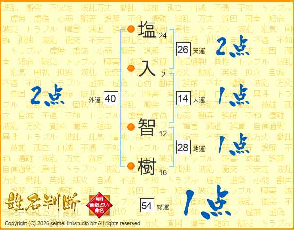 生活面を象徴する運勢です。外部から受ける影響力を表し、結婚運、家庭運や職場、環境への順応性を表します。総運から人運を引いた画数。姓や名が1文字の場合を除く。