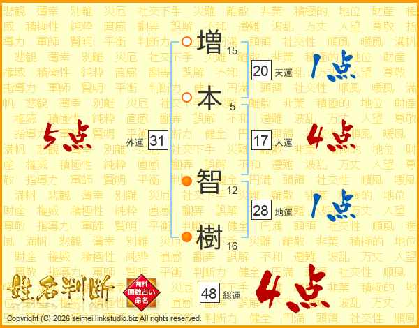 増(15画)本(5画) 智(12画)樹(16画)
