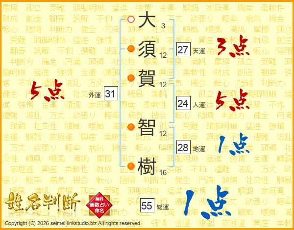 大(3画)須(12画)賀(12画) 智(12画)樹(16画)