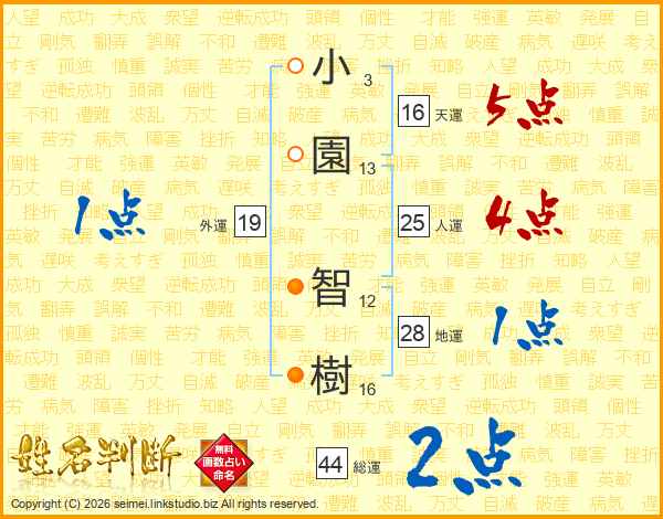 生活面を象徴する運勢です。外部から受ける影響力を表し、結婚運、家庭運や職場、環境への順応性を表します。総運から人運を引いた画数。姓や名が1文字の場合を除く。