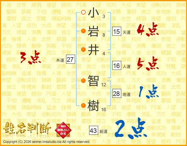 小(3画)岩(8画)井(4画) 智(12画)樹(16画)