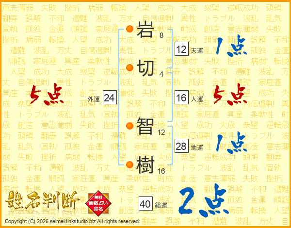 岩(8画)切(4画) 智(12画)樹(16画)
