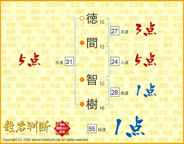 徳(15画)間(12画) 智(12画)樹(16画)
