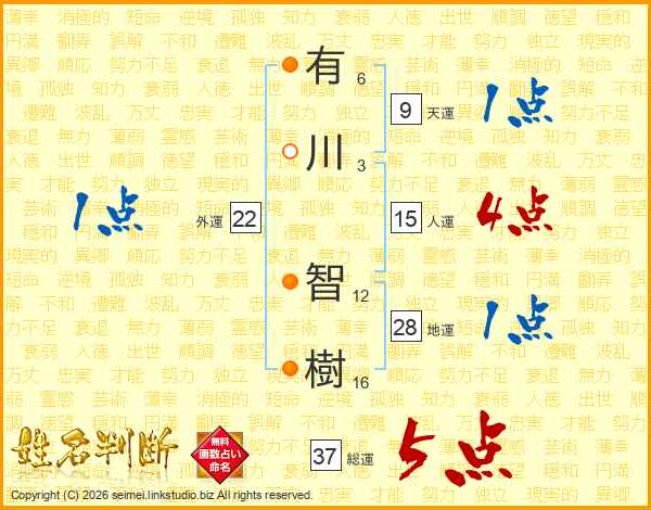 あなたの人生を表す1番重要な運勢です。生涯を通じて影響する総合運となり、主に50歳以降の晩年期に影響を及ぼします。苗字と名前の合計画数。