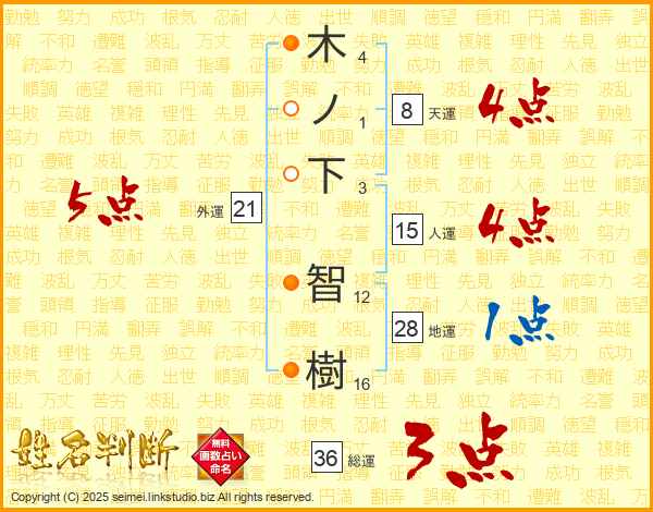 木(4画)ノ(1画)下(3画) 智(12画)樹(16画)