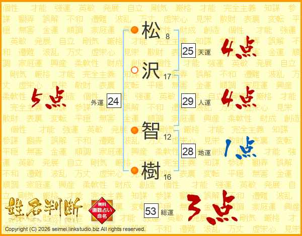 松(8画)沢(17画) 智(12画)樹(16画)
