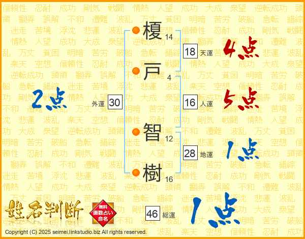 榎(14画)戸(4画) 智(12画)樹(16画)