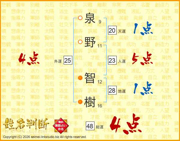 泉野智樹さんの総運は48画の4点!