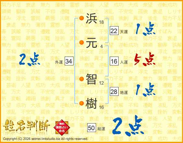 浜(18画)元(4画) 智(12画)樹(16画)