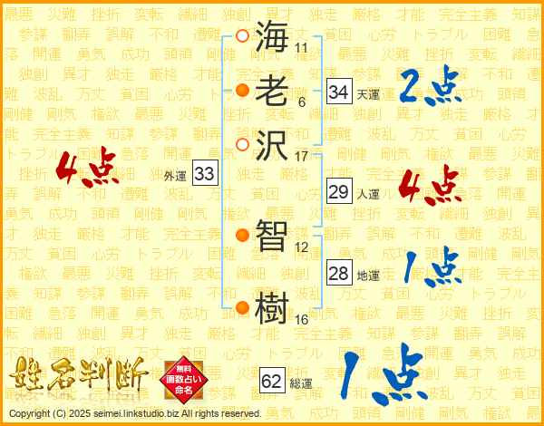海(11画)老(6画)沢(17画) 智(12画)樹(16画)