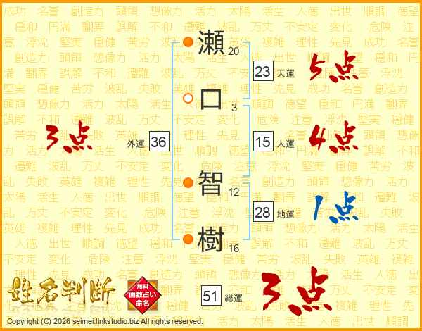 瀬(20画)口(3画) 智(12画)樹(16画)