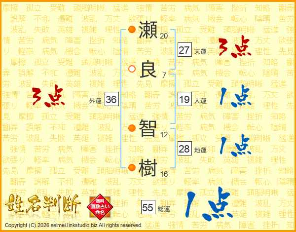 瀬(20画)良(7画) 智(12画)樹(16画)