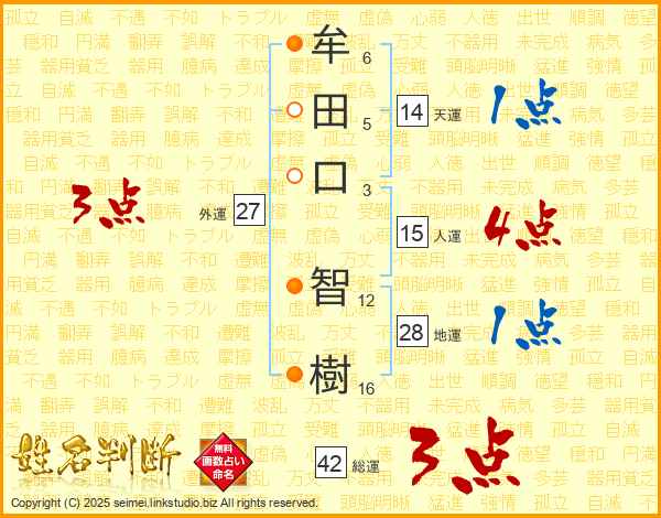 牟(6画)田(5画)口(3画) 智(12画)樹(16画)