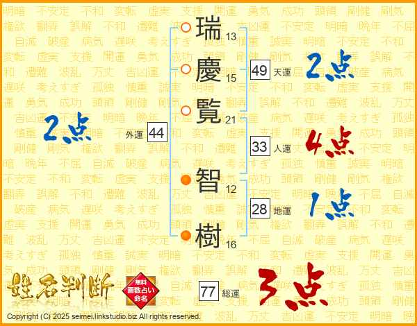 瑞(13画)慶(15画)覧(21画) 智(12画)樹(16画)