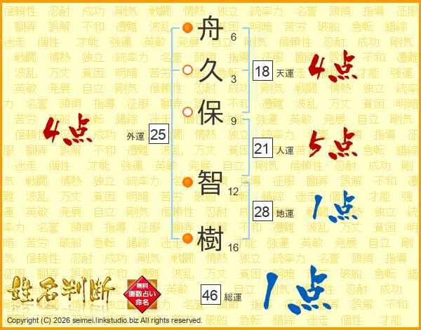 舟(6画)久(3画)保(9画) 智(12画)樹(16画)