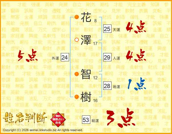 あなたの人生を表す1番重要な運勢です。生涯を通じて影響する総合運となり、主に50歳以降の晩年期に影響を及ぼします。苗字と名前の合計画数。