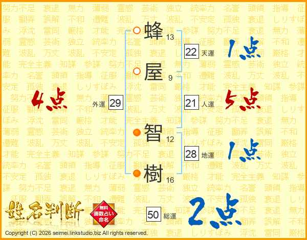 蜂(13画)屋(9画) 智(12画)樹(16画)