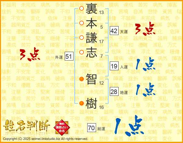 裏本謙志智樹さんの人運は19画の1点!