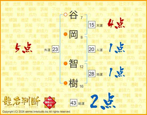 谷(7画)岡(8画) 智(12画)樹(16画)