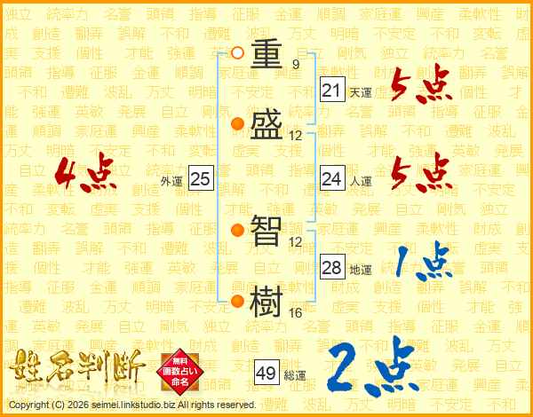 あなたの人生を表す1番重要な運勢です。生涯を通じて影響する総合運となり、主に50歳以降の晩年期に影響を及ぼします。苗字と名前の合計画数。