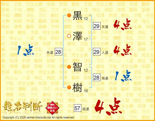 黒(12画)澤(17画) 智(12画)樹(16画)