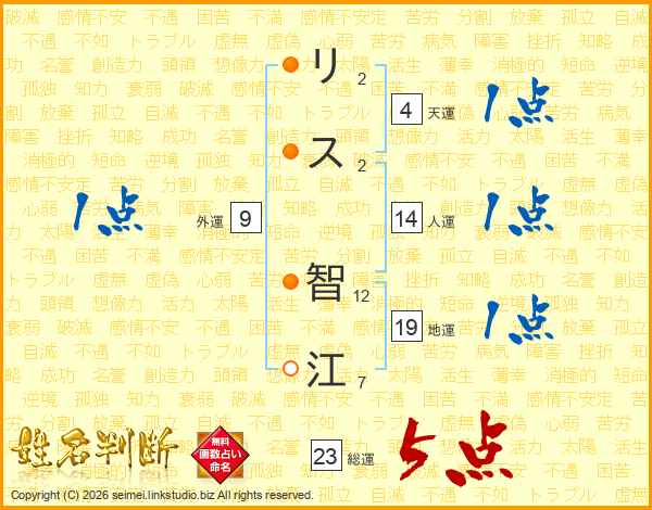 生活面を象徴する運勢です。外部から受ける影響力を表し、結婚運、家庭運や職場、環境への順応性を表します。総運から人運を引いた画数。姓や名が1文字の場合を除く。