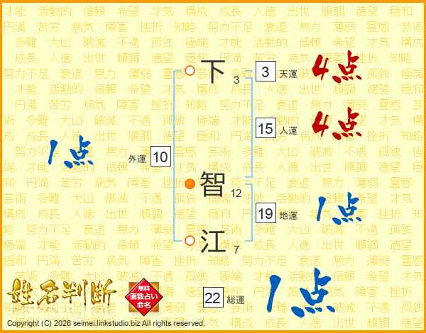 生活面を象徴する運勢です。外部から受ける影響力を表し、結婚運、家庭運や職場、環境への順応性を表します。総運から人運を引いた画数。姓や名が1文字の場合を除く。