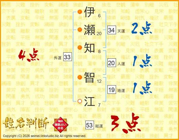 伊(6画)瀬(20画)知(8画) 智(12画)江(7画)