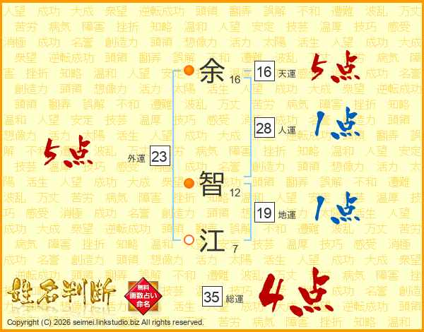 生活面を象徴する運勢です。外部から受ける影響力を表し、結婚運、家庭運や職場、環境への順応性を表します。総運から人運を引いた画数。姓や名が1文字の場合を除く。