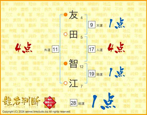 生活面を象徴する運勢です。外部から受ける影響力を表し、結婚運、家庭運や職場、環境への順応性を表します。総運から人運を引いた画数。姓や名が1文字の場合を除く。