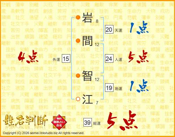 岩(8画)間(12画) 智(12画)江(7画)