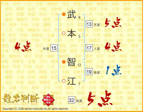 生活面を象徴する運勢です。外部から受ける影響力を表し、結婚運、家庭運や職場、環境への順応性を表します。総運から人運を引いた画数。姓や名が1文字の場合を除く。