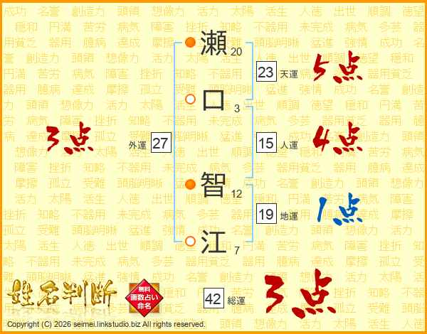 瀬(20画)口(3画) 智(12画)江(7画)