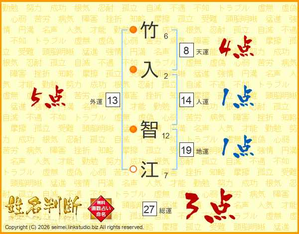 生活面を象徴する運勢です。外部から受ける影響力を表し、結婚運、家庭運や職場、環境への順応性を表します。総運から人運を引いた画数。姓や名が1文字の場合を除く。
