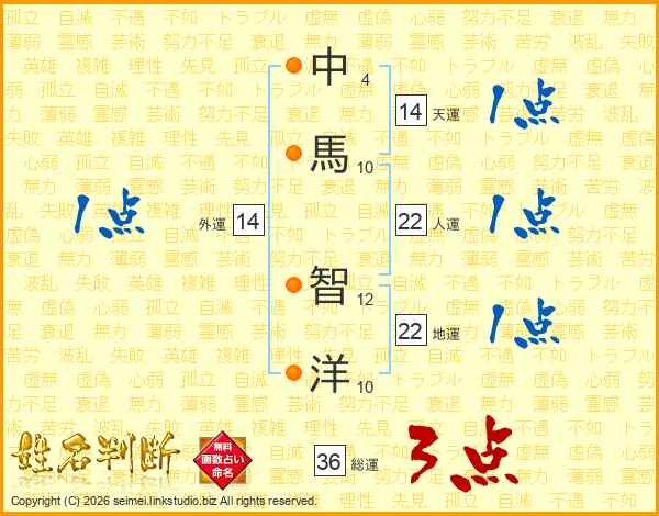 生活面を象徴する運勢です。外部から受ける影響力を表し、結婚運、家庭運や職場、環境への順応性を表します。総運から人運を引いた画数。姓や名が1文字の場合を除く。