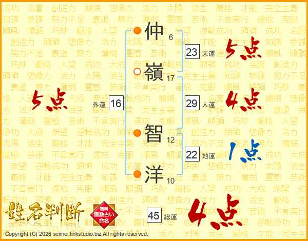 仲(6画)嶺(17画) 智(12画)洋(10画)