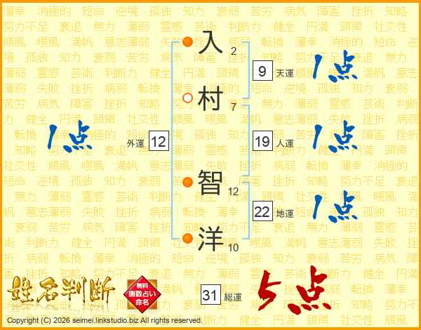 生活面を象徴する運勢です。外部から受ける影響力を表し、結婚運、家庭運や職場、環境への順応性を表します。総運から人運を引いた画数。姓や名が1文字の場合を除く。
