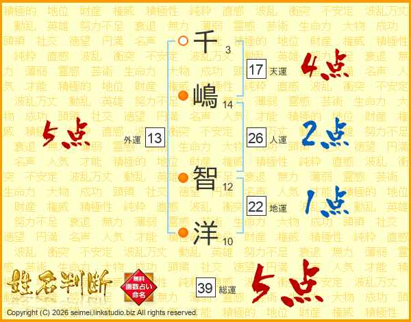 千(3画)嶋(14画) 智(12画)洋(10画)