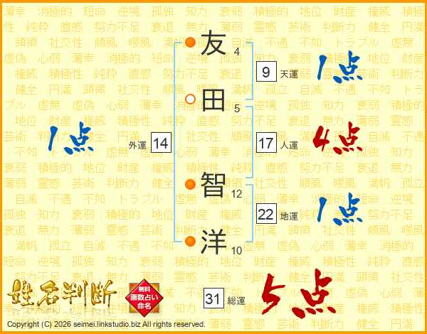 生活面を象徴する運勢です。外部から受ける影響力を表し、結婚運、家庭運や職場、環境への順応性を表します。総運から人運を引いた画数。姓や名が1文字の場合を除く。